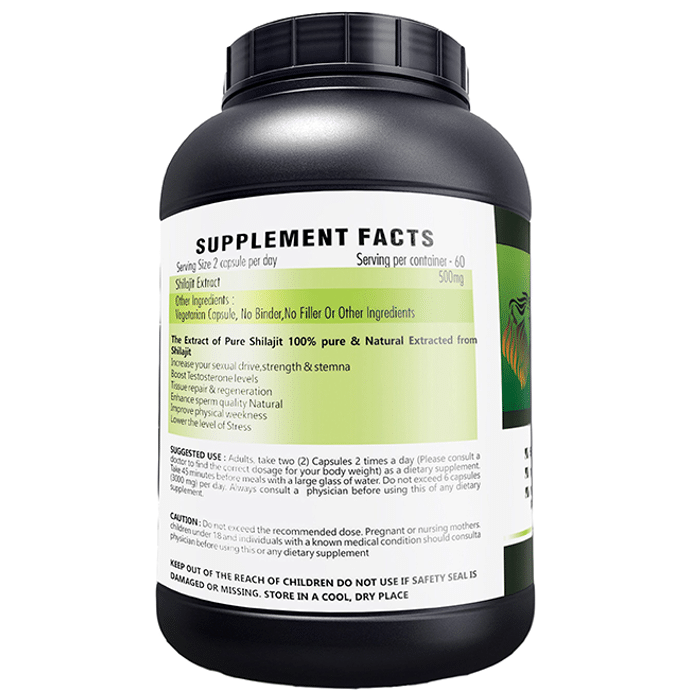 Veda Maxx Nutrition Shilajit Extract 500mg Capsule contains an ayurvedic herb Shilajit which is known for its aphrodisiac properties. Enriched with fulvic acid and minerals such as copper, silver, zinc and iron, it helps in boosting strength and stamina .It not only helps in improving testosterone levels but also promotes overall sexual wellness. It helps in improving cognitive functions and reduces the risk of Alzheimer's disease. Iron deficiency and healthy heart functioning are benefits associated with it. | Key Ingredients: Shilajit | Key Benefits: Helps in improving testosterone level Aids in improving vigour and vitality Useful in reducing fatigue Reduces the signs of ageing Beneficial in case of iron deficiency | Directions For Use: Use as directed by the physician. | Safety Information: Read the label carefully before use Keep out of the reach of children Keep the container tightly closed Do not use if the seal is broken Do not exceed the recommended dosage Store in a cool and dry place, away from direct sunlight