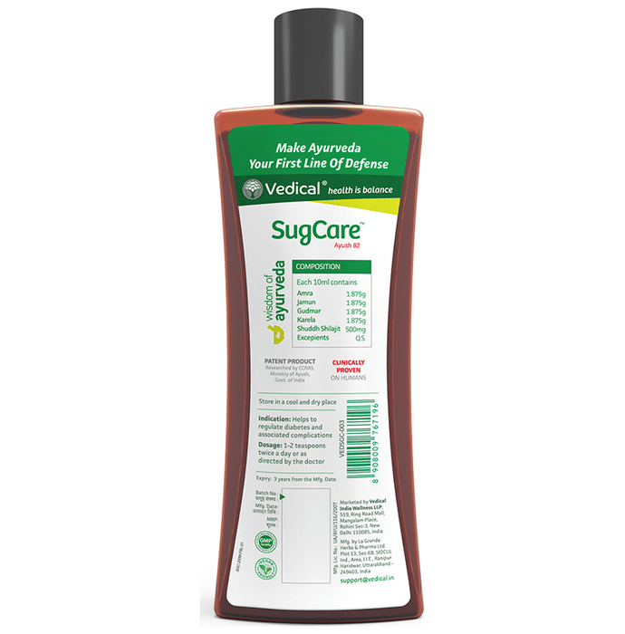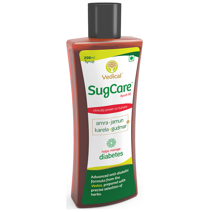Vedical SugCare Syrup is an ayurvedic remedy which is helpful in managing mild to moderate diabetes. It is based on formulation of herbs such as Amra, Jamun, Karela and is effective in relieving complications of Diabetes. It is safe to use and is also beneficial for people with high sugar levels or advance-staged diabetes if taken in synergy for a few weeks. | Key Ingredients: Amra Jamun Gudmar Karela | Key Benefits: Helps in regulating diabetes and associated complications Useful in case of mild to moderate diabetes Formulated with herbs Clinically tested on humans | Directions For Use: Take 1-2 teaspoons twice a day 30 minutes before meal or as directed by the doctor. | Safety Information: Read the label carefully before use Keep away from children Do not exceed the recommended dosage Store in a cool and dry place