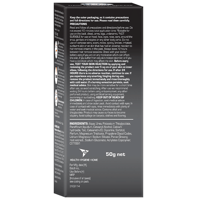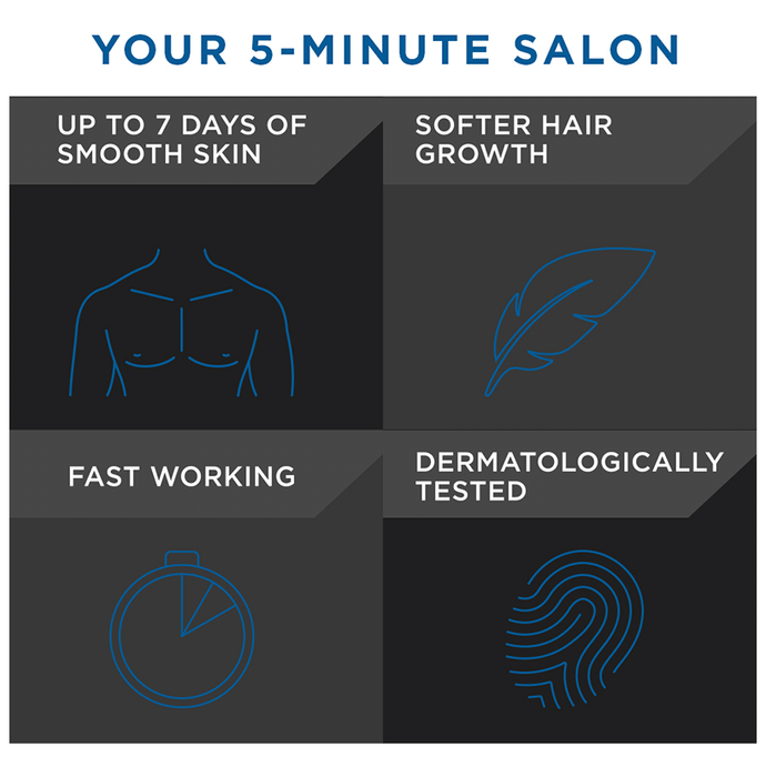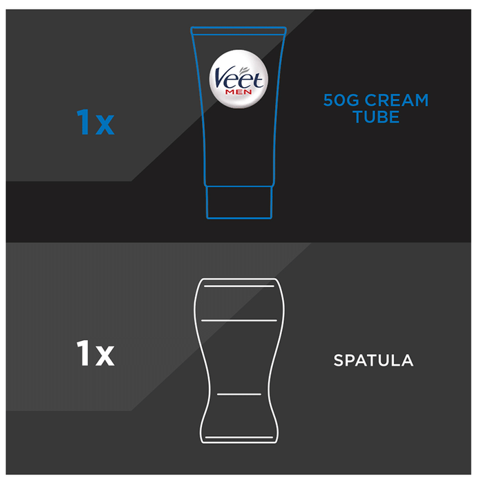 Veet Hair Removal Cream for Men is made from ingredients that help in removing hair from the surface of the skin. It can be used to remove hair from the chest, arms, legs, and underarms in men. It is available for people with sensitive skin as well as normal skin. | Key Ingredients: Ginseng Extracts | Key Benefits: Helps to gently remove hair from the follicle bulb while giving superior and long-lasting smoothness Its special ingredients and fresh floral fragrance leave the skin silky soft, moisturized, and fresh Has anti-inflammatory properties which give a soothing effect | Directions For Use: Using the curved part of the spatula, spread the cream evenly to fully coat the hair Leave the cream on the skin for 3 minutes and then use the spatula to gently remove a small test area of cream. If the hair comes away easily, remove the rest with the help of the spatula If the hair is more stubborn then leave the cream on for up to 3 minutes longer, but do not leave the cream for more than 6 minutes as it may irritate Rinse skin thoroughly with water and dry | Safety Information: Read the label carefully before use Store in a cool dry place away from direct sunlight Keep out of reach of the children Avoid contact with private areas Do not keep for a longer duration than 3-6 minutes
