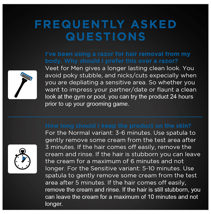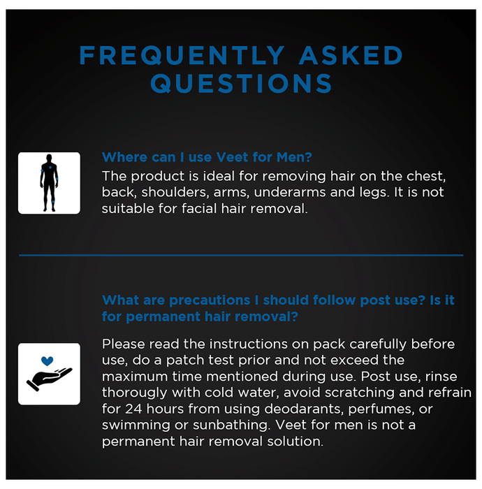 Veet Hair Removal Cream for Men Sensitive Skin Veet Hair Removal Cream for Men is made from ingredients that help in removing hair from the surface of the skin. It can be used to remove hair from the chest, arms, legs, and underarms in men. It is available for people with sensitive skin as well as normal skin.