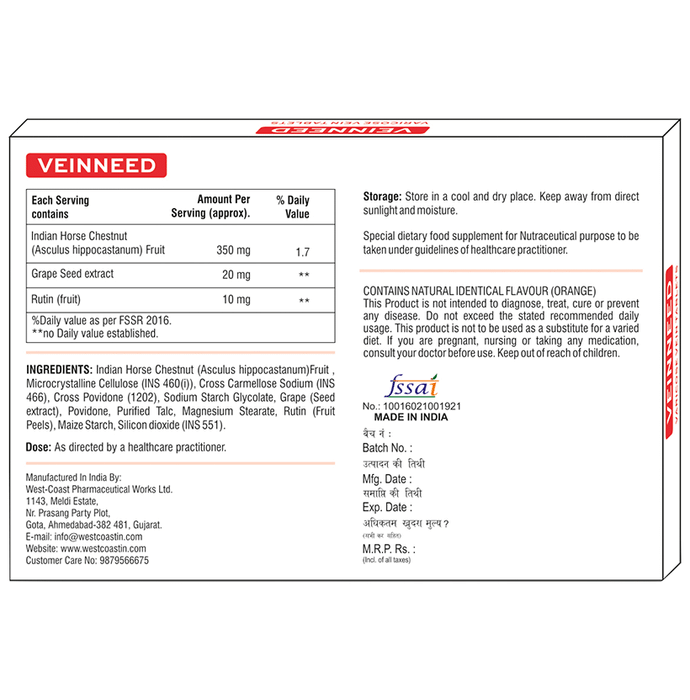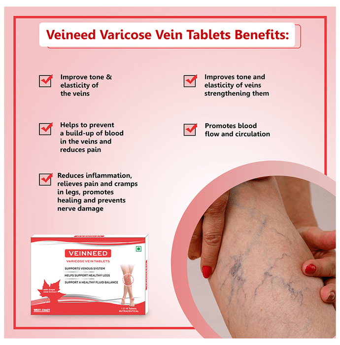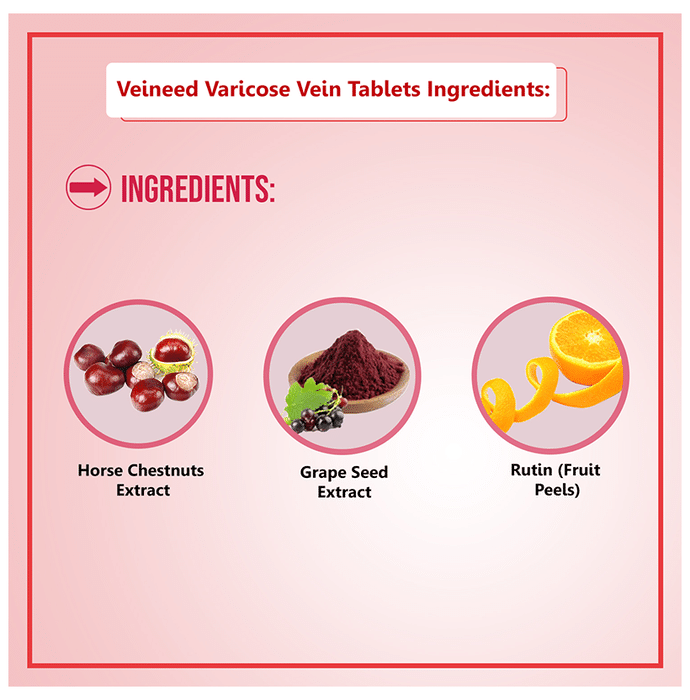 Veinneed Tablet Anti-varicose and spider veins treatment Veined Varicose Vein Gel is infused with aloe vera, horse chestnut and red wine extract. The blue, twisted blood vessels that protrude up around the legs are called varicose veins. Varicose veins, spider veins, painful legs/feet, heaviness and restless leg syndrome can all be treated with this gel. It's a healthier alternative to the common pains, muscle stiffness and soreness that everyone gets from time to time. Chronic venous insufficiency can be adequately treated with it. | Key Ingredients: Grape seed extract Indian horse chestnut fruit Rutin (fruit) | Key Benefits: Clinically Studied Ingredients: Veinneed Varicose Vein tablets contain grape seed extract, Indian horse chestnut fruit and rutin How it works: Varicose veins are caused by problems with blood flow from the veins of the legs to the heart, causing discomfort. Veinneed Varicose tablet can help improve blood flow, reduces leakage and rupture of veins, prevents blood clotting and also acts as an antioxidant to promote healing Promotes healthy veins: Rutin (a natural flower) can help strengthen and increase flexibility in blood vessels, such as the arteries and capillaries. Strengthened blood vessels can improve your overall health. This may help ease related conditions, including bruises, spider veins and varicose veins Best for: Support venous system, helps support healthy legs and supports a healthy fluid balance | Directions For Use: As directed by the physician. | Safety Information: Store in a cool and dry place Keep away from the reach of children Do not exceed the recommended dosage