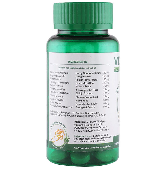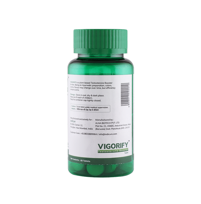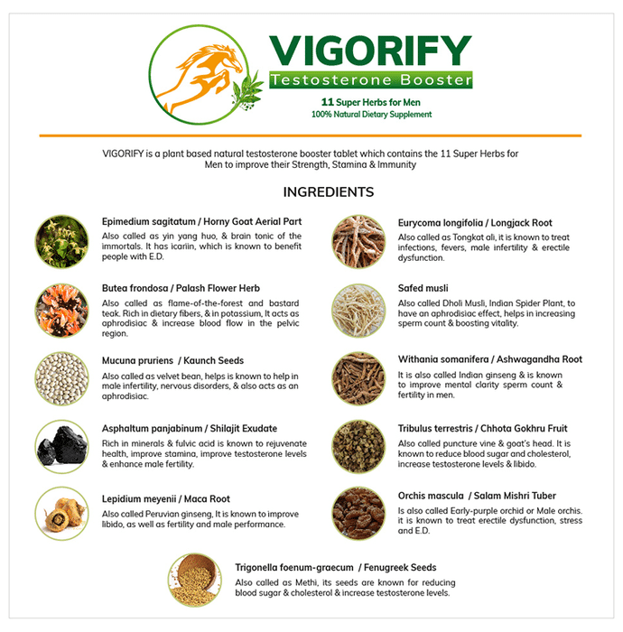 Vigorify Testosterone Booster Tablet supports fat reduction, lean muscle build-up, performance, sleep, strength development and athletic performance. It provides the extra push one needs to perform during the workout sessions. It may help tackle problems like low sperm count, lack of libido, general weakness and premature ejaculation. The tablets help boost energy levels, increase immunity and reduce stress. | Key Ingredients: Epimedium sagitatum Butea frondosa Mucuna pruriens Asphaltum panjabinum Lepidium meyenii Eurycoma longifolia Safed musli Withania somanifera Tribulus terrestris Orchis mascula | Key Benefits: These capsules help in boosting muscle strength It supports fat reduction and muscle recovery It improves endurance and athletic performance These capsules may help in enhancing immune strength It may help to improve testosterone levels and enhances energy | Directions For Use: Use as directed on the label. | Safety Information: Read the label carefully before use Store in a cool and dry place away from direct sunlight Keep out of reach of children "