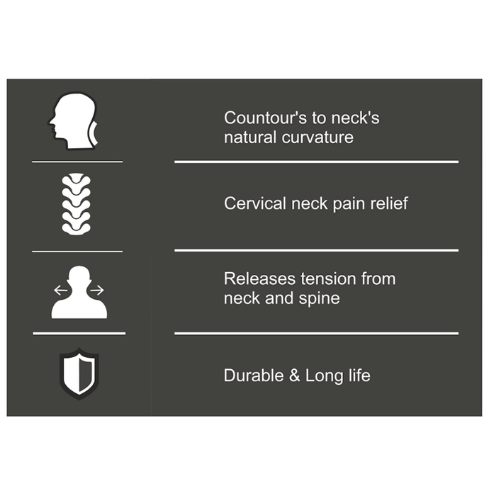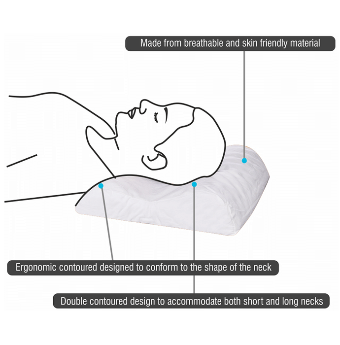 Vissco 0312 Cervical Contoured Large Pillow is a scientific design which helps to maintain the neck in slight hyperextension, providing optimal muscle relaxation and proper support to the head and neck during sleep. | Uses: It is constructed to provide healthy support to neck and spine. It is useful in the condition of Cervical spondylitis and Mild sprain / Stiff neck. | Product Specifications and Features: This pillow has two contours with varied gradients for extension This double contoured shape allows the patient to select a comfort level that he needs by simply reversing the pillow. This is especially helpful for patients suffering from spondylosis The product is skin friendly It provides soft support It is anatomically designed and the fabric has been tested for its anti-fungal anti-bacterial | Note: Warranty: 6 Months Customer Care Id: [email protected] Customer Care Number: 022-43330376 (Monday to Saturday (10 am to 6 pm)) | Directions For Use: Use as per requirement or as directed by the physician. | Safety Information: Read the label carefully before use Store in a cool dry place away from direct sunlight Keep out of reach of the children Avoid physical damage