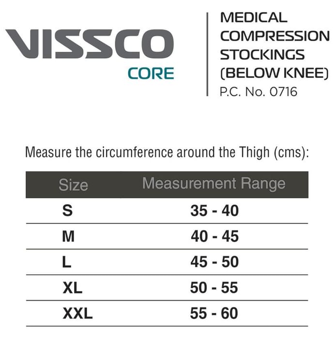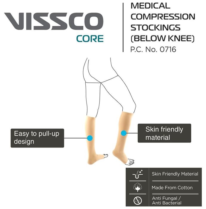 Vissco Core 0716 Medical Compression Stockings Medium Below Knee Vissco Core 0716 Medical Compression Stockings provide controlled compression to the legs to squeeze away abnormal back flow of blood into the superficial veins that lie just beneath the surface of the skin from the perforating veins. It is used in all forms of venous disease including blood pools or congests in legs.