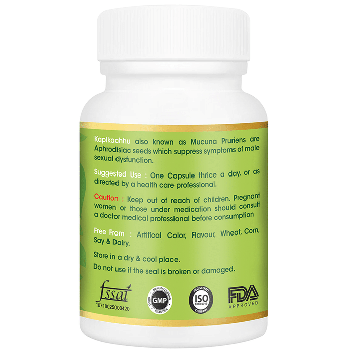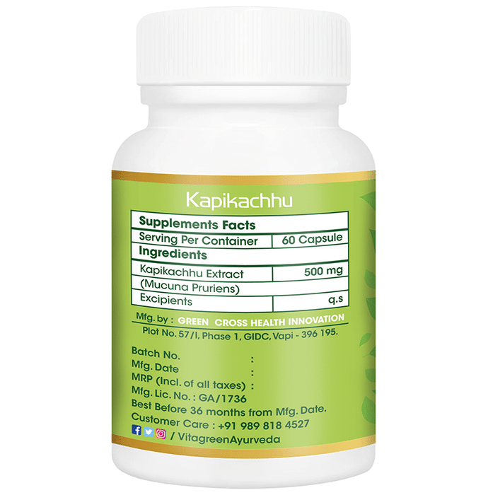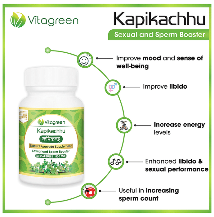 Vitagreen Kapikachhu 500mg Capsule Vitagreen Kapikachhu 500mg Capsule is an ayurvedic product that may improve strength, stamina and energy level. It helps to boost men's performance and enhance strength. It helps to improve overall fitness. It may also be beneficial to increase testosterone levels naturally.