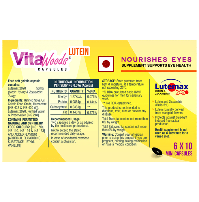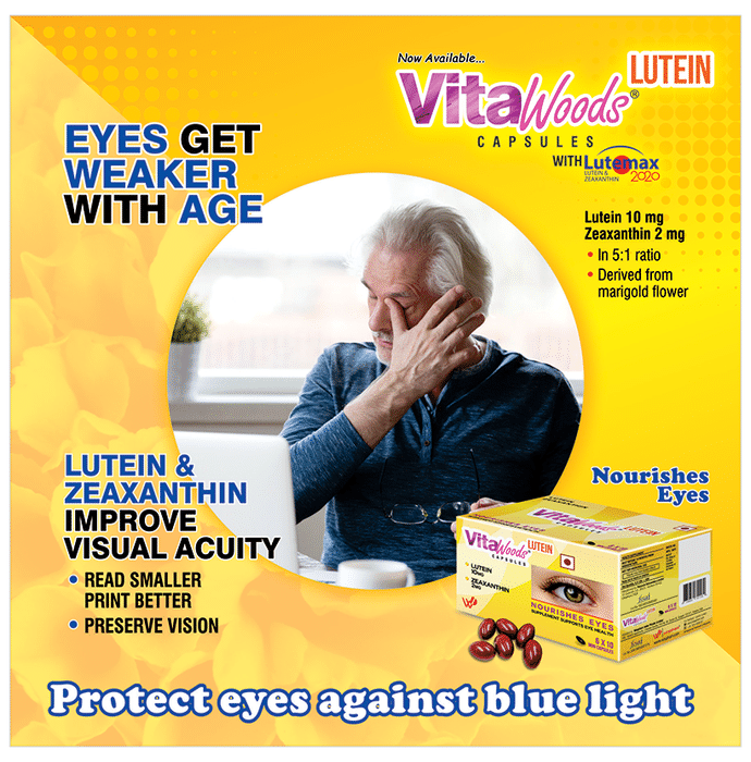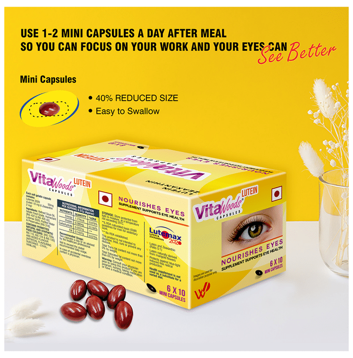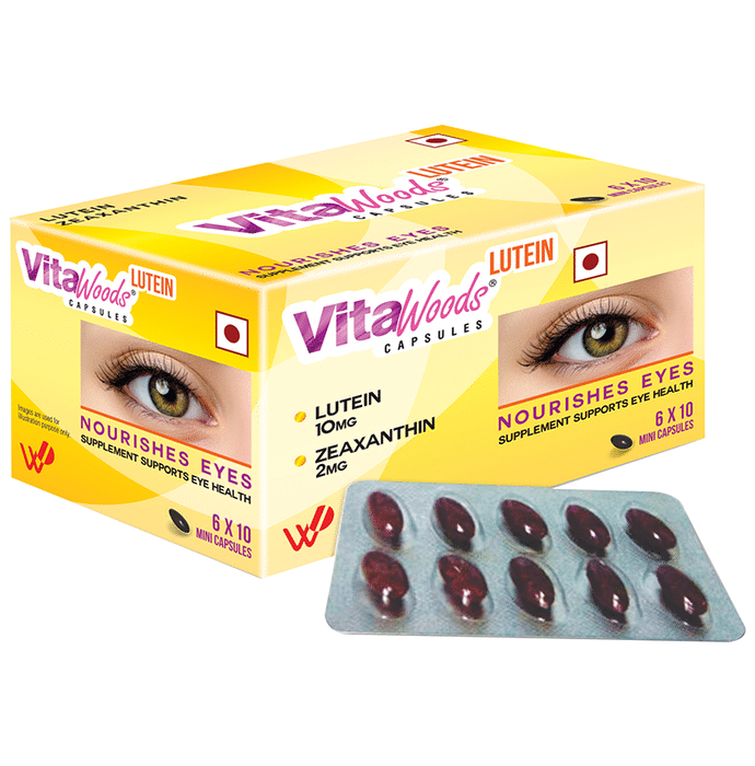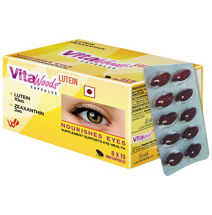 Vitawoods Lutein Capsule is an eye nutritional supplement which contains lutemax 2020 that provides the carotenoids with the necessary nutrition needed for eye health and superior vision. It helps improve visual acuity that helps people see fine details and read small print better. It also improves your visual function that allows to read better at night and drive easy with less glare and bright lights. It is also helpful for people with early risk of ARMD and diabetic retinopathy. | Key Ingredients: Lutein 10 mg Zeaxanthin 2 mg | Key Benefits: It helps improve visual acuity that helps to see fine details and read small print better It works to improve your visual function that helps read better at night and drivie easy with less glare and bright lights It is extremely helpful for people with early risk of ARMD and diabetic retinopathy It works in strengthening macula in eyes It helps prevent and delay the natural deterioration of eyes It helps provide relief to eyes from digital strain and blue lights | Direction For Use: 2 Mini capsules a day preferably after meal or as recommended by health care professionals, not to exceed the standard recommended daily use. | Safety Information: You should not use the product if you are allergic to any of the ingredients You should should not exceed the recommended dosages, if by accident you consume excess dosage than recommended, then consult your physician Read the label carefully before use Do not exceed the recommended dosage Store in a cool and dry place away from direct sunlight Keep out of reach of children