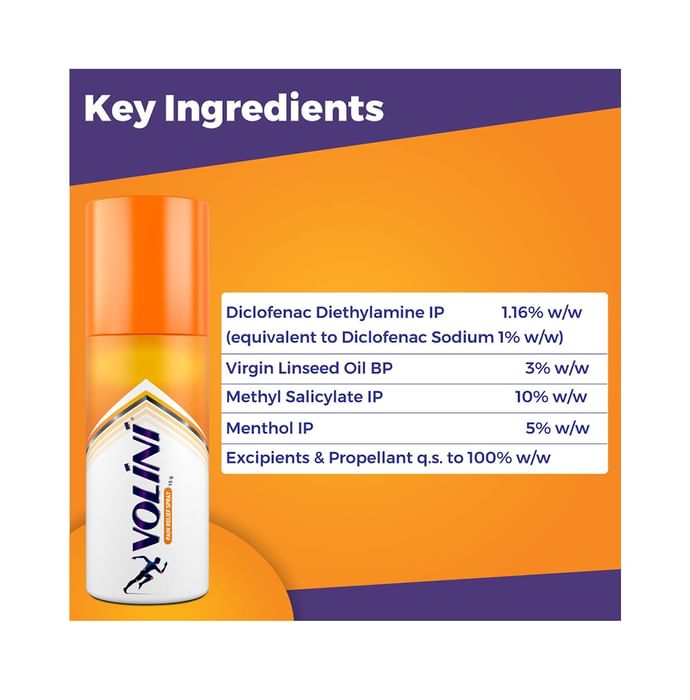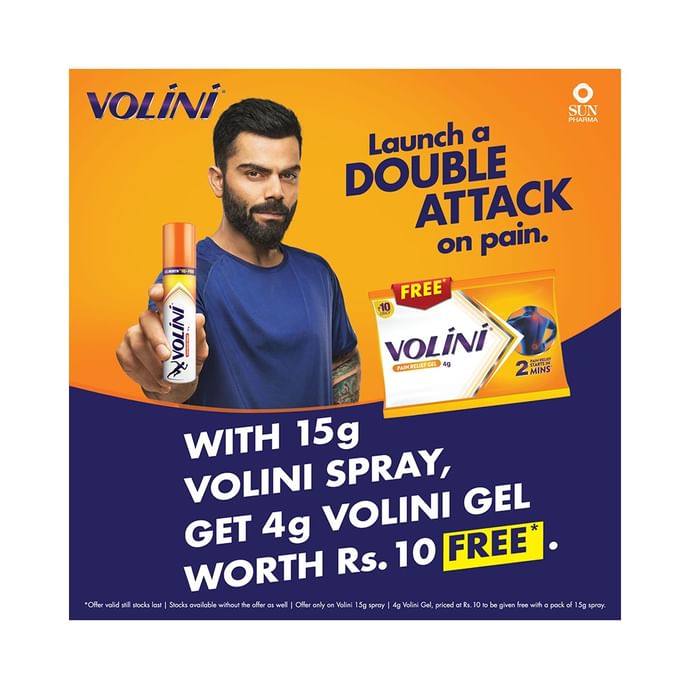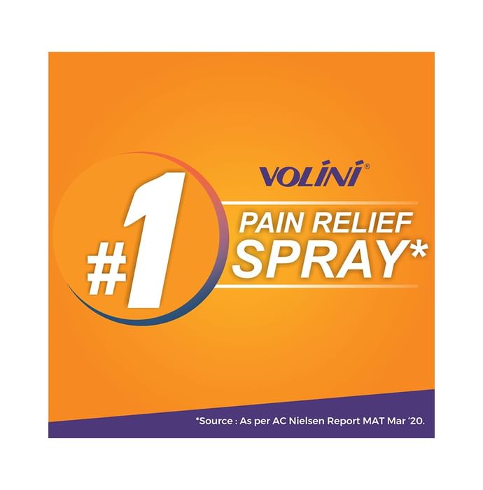Volini Pain Relief Spray with Volini Pain Relief Gel 4g Free Volini Spray is a pain relief spray which provides instant relief from muscle pain, sprain and pain in the joints. Scientifically formulated with the ingredients such as Diclofenac diethylamine, Methyl Salicylate and Menthol, it contains microparticles which provide quick relief from pain by penetrating deeply. Musculoskeletal and joint pain can also be cured by its use.