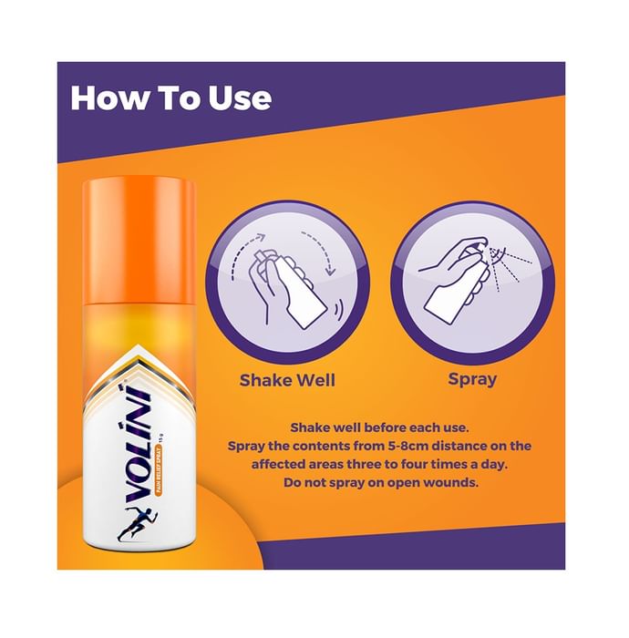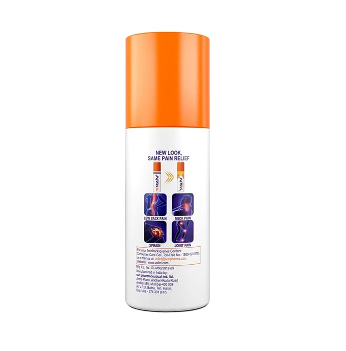 Volini Spray is a pain relief spray which provides instant relief from muscle pain, sprain and pain in the joints. Scientifically formulated with the ingredients such as Diclofenac diethylamine, Methyl Salicylate and Menthol, it contains microparticles which provide quick relief from pain by penetrating deeply. Musculoskeletal and joint pain can also be cured by its use. | Key Ingredients: Diclofenac Diethylamine Methyl Salicylate Menthol Linseed oil | Key Benefits: Provides instant pain relief Provides effective relief from pain in Joint, knee, back, neck and shoulder Helps in pain caused due to muscle pulls, sprain, strain and sports injuries Microparticles allow deeper penetration and provide quick pain relief Useful in musculoskeletal, joint, and soft tissue disorders | Directions For Use Shake well before each use. Spray the contents from 5 cm distance on the affected areas 3-4 times in a day or, as directed by the physician. | Safety Information: Read the label carefully before use Keep out of the reach of children Use under medical supervision Do not exceed the recommended dosage For external use only Should be applied only to intact skin surfaces and not to skin wounds and open injuries Should not come into contact with eyes, mucous membranes and should not be ingested Store in a cool and dry place