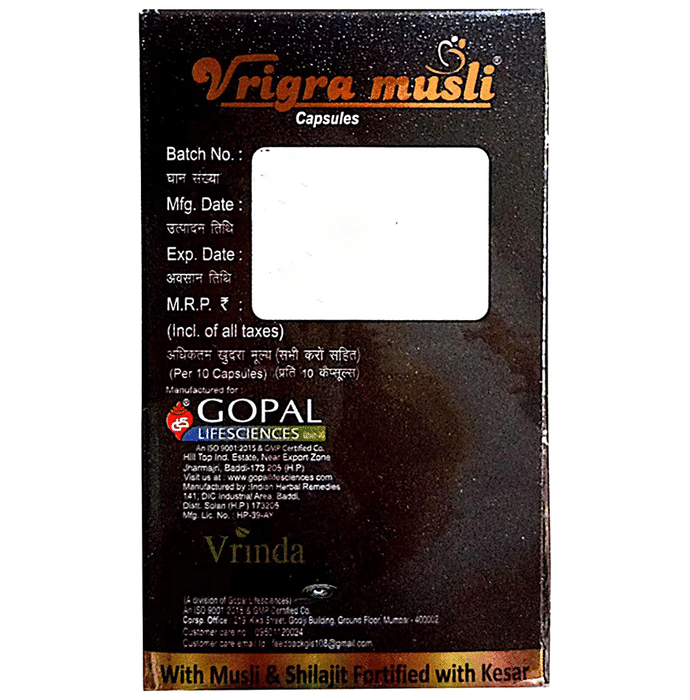 Vrinda Viagra Musli Capsule Musli Vrigra Capsule is an ayurvedic medicine obtained from the extract of Musli. It is a rare herb found in the wild Indian forest. It is traditionally used for arthritis, cancer, diabetes, boosting vitality and improving sexual performance.