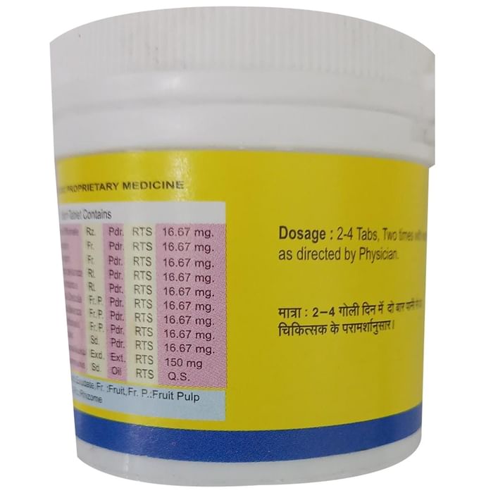 Vyas Medohar Guggulu Tablet Vyas Medohar Guggulu Tablet contains Saunthi, Kali Mirch, Pipal, Chitrakmool, Nagarmotha, Vavidang, Guggulu, and Erand tail as main active ingredients. Vyas Medohar Guggulu Tablet burns body fat, improves digestive functions and effective in rheumatic & respiratory disorders. Key benefits/uses of Vyas Medohar Guggulu Tablet: Role of active ingredients: - Saunth: Contains thermogenic agents that are used to burn fat and treat obesity - Kali Mirch: Has carminative, analgesic, anti-inflammatory, immunomodulatory, antiseptic, laxative and diuretic properties and also used for treating obesity - Pipal: Used in obesity, allergic rhinitis etc - Nagarmotha: Effective in promoting appetite, useful in skin diseases and diarrhea.It is also used in formulations preventing liver and lung diseases - Chitrakmool: Used in treating intestinal troubles, dysentery, leucoderma, inflammation, piles, bronchitis, itching, and diseases of the liver - Vaividang: Detoxifies blood, improves skin complexion and also used for rejuvenation purpose of the body - Guggulu: Used for arthritis, lowering high cholesterol (atherosclerosis), skin diseases, and weight loss - Erand oil: Used in the treatment of inflammation and acts as the laxative and helps in weight loss Directions for use/Dosage: - Take 2 tablets twice a day with lukewarm water or as directed by the physician Safety Information: - Read the label carefully before use