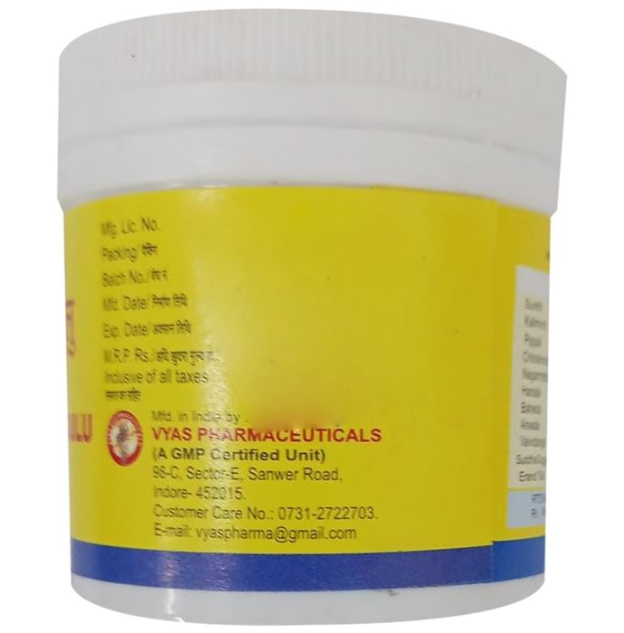 Vyas Medohar Guggulu Tablet contains Saunthi, Kali Mirch, Pipal, Chitrakmool, Nagarmotha, Vavidang, Guggulu, and Erand tail as main active ingredients. Vyas Medohar Guggulu Tablet burns body fat, improves digestive functions and effective in rheumatic & respiratory disorders. Key benefits/uses of Vyas Medohar Guggulu Tablet: Role of active ingredients: - Saunth: Contains thermogenic agents that are used to burn fat and treat obesity - Kali Mirch: Has carminative, analgesic, anti-inflammatory, immunomodulatory, antiseptic, laxative and diuretic properties and also used for treating obesity - Pipal: Used in obesity, allergic rhinitis etc - Nagarmotha: Effective in promoting appetite, useful in skin diseases and diarrhea.It is also used in formulations preventing liver and lung diseases - Chitrakmool: Used in treating intestinal troubles, dysentery, leucoderma, inflammation, piles, bronchitis, itching, and diseases of the liver - Vaividang: Detoxifies blood, improves skin complexion and also used for rejuvenation purpose of the body - Guggulu: Used for arthritis, lowering high cholesterol (atherosclerosis), skin diseases, and weight loss - Erand oil: Used in the treatment of inflammation and acts as the laxative and helps in weight loss Directions for use/Dosage: - Take 2 tablets twice a day with lukewarm water or as directed by the physician Safety Information: - Read the label carefully before use - Do not exceed the recommended dose - Keep out of the reach and sight of children