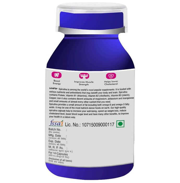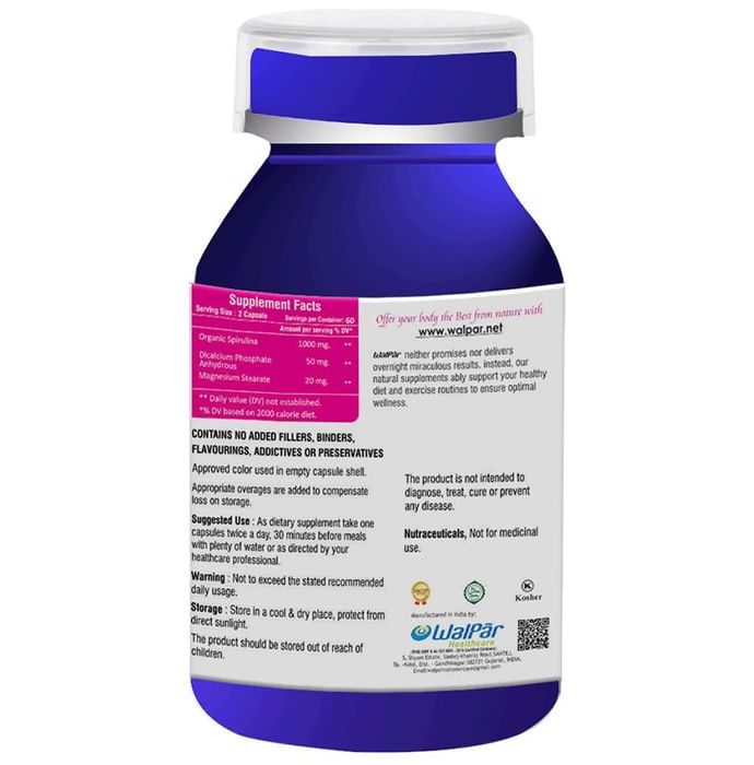Walpar Spirulina Capsule is suggested for improving the immune system and also aids in ridding the liver of any toxins hence, cleansing it. It also helps to maintain good cardiovascular health. | Key Ingredient: Spirulina | Key Benefits: It is used in helping cleanse the liver of any toxins It is useful in increasing the strength of the immune system It helps in boosting energy levels in the body Helps in reducing bad cholesterol and triglyceride levels in the body while also improving the good cholesterol levels | Directions For Use: Use as directed by the physician. | Safety Information: Read the label carefully before use Store in a cool dry place away from direct sunlight Keep out of reach of the children