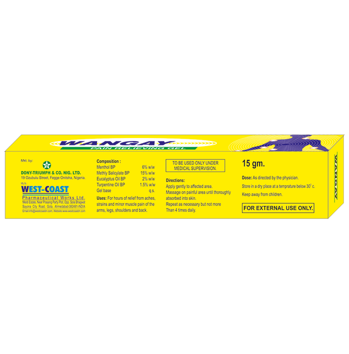 Wangay Gel is a topical analgesic (pain killer) medication primarily used to relieve joint pain, low back pain, sprains, strains, and muscular pain. It may also relieve joint and muscular discomfort brought on by sports-related injuries. | Key Ingredients: Menthol Methyl salicylate Eucalyptus oil Turpentine oil | Key Benefits: It may be used to help facilitate the process of ligament regeneration It provides relief from gouty inflammation of the joint It assists in reducing joint stress and preserves joint cartilage | Directions For Use: Read the label carefully before use | Safety Information: Do not exceed the recommended dosage Store in a cool and dry place away from direct sunlight Keep out of reach of children