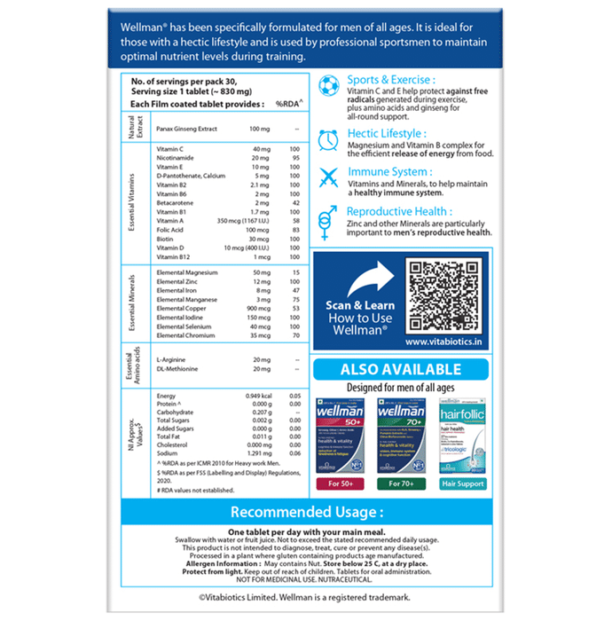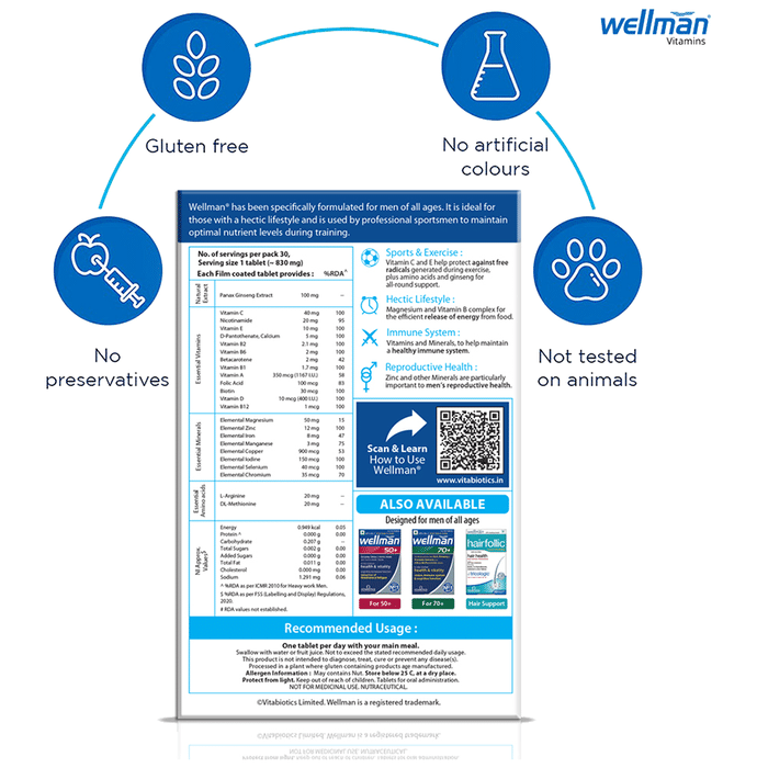 Wellman Health Supplement for Men Tablet Wellman Health Supplement for Men Tablet is a health supplement with natural ginseng extract, vitamins, minerals and amino acids that support health and vitality. Ginseng has antioxidant and anti-inflammatory effects on the body.