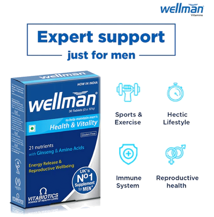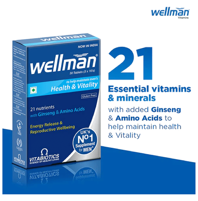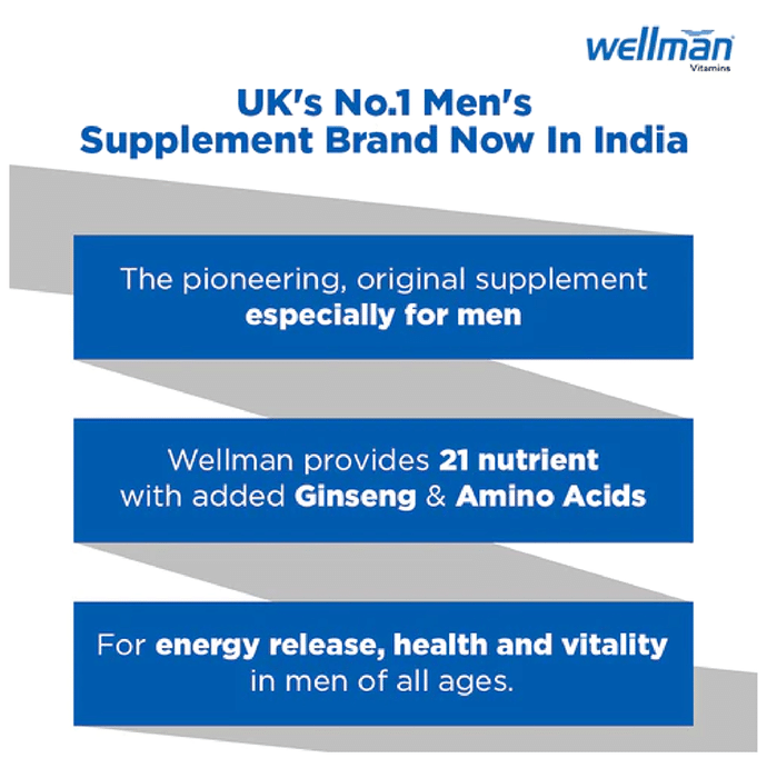 Wellman Health Supplement for Men Tablet is a health supplement with natural ginseng extract, vitamins, minerals and amino acids that support health and vitality. Ginseng has antioxidant and anti-inflammatory effects on the body. | Key Ingredients: Panax ginseng extract Vitamin C Vitamin E Vitamin D Vitamin B12 Elemental zinc Elemental magnesium Elemental iron L-arginine | Key Benefits: It helps enhance sports and athletic performance Ginseng helps strengthen the immune system and enhances brain function Vitamin B6 and vitamin B12 help maintain energy levels Magnesium and iron help reduce fatigue and tiredness Zinc helps maintain normal testosterone levels in the body | Good to Know: Gluten, preservatives and artificial colours free | Effects of Deficiency: Lack of amino acids, vitamins, and magnesium can cause: Stress Fatigue Weakness | Product Form: Tablet | Directions for Use: As prescribed by your medical practitioner | Safety Information: Store at room temperature of 15 to 25 C Do not exceed the recommended dosage Keep out of reach of children | Quick Tips: Consume alongside a balanced diet for maximum benefits. | Frequently Asked Questions: | Q. Do supplements have side effects? Side effects from supplements can happen if taken in the wrong dosage or when taken along with certain medicines. Please consult your healthcare provider before taking any supplements. | Q. Can supplements improve my health? Good quality supplements can help enhance health. However, they add to the diet and should not be considered a substitute for food.