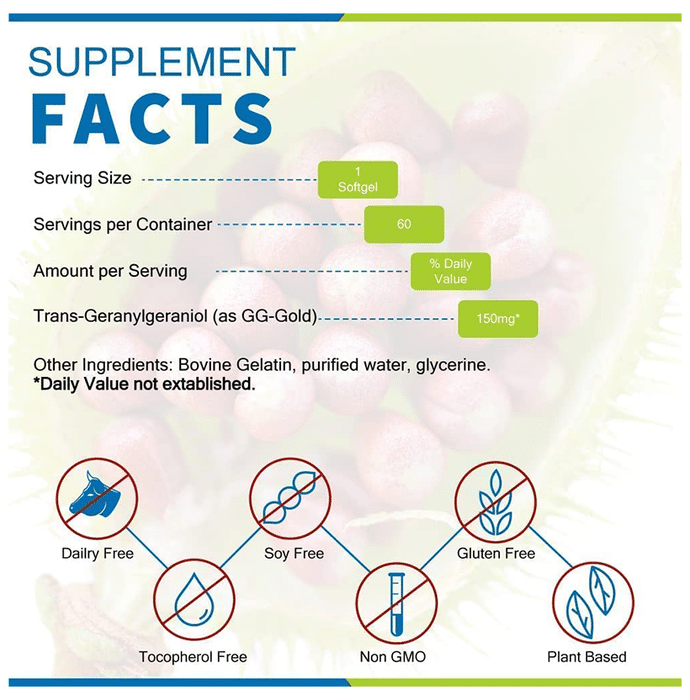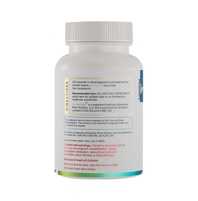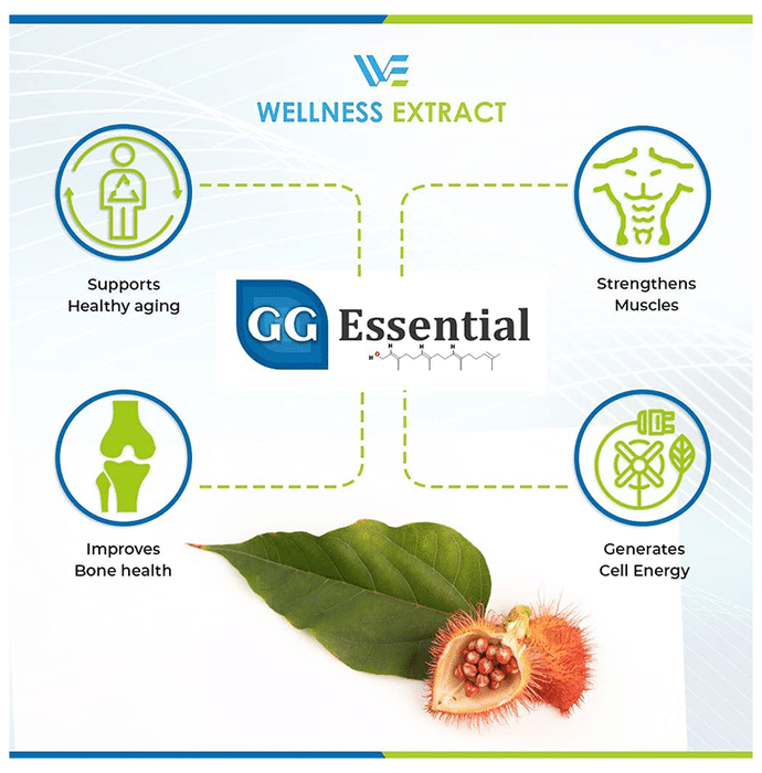 Wellness Extract GG Essential Geranylgeraniol 150mg Softgel GG Essential is a GG supplement extracted from the Amazonian plant named Annatto (Bixa Orellana) using solvent and chemical-free technology. Dr Barrie Tan, a well-known researcher, is behind such an amazing technology. This makes GG Gold an ideal geranylgeraniol supplement, therefore standing superior among its competitors in the market. | Key Ingredients: Trans-Geranylgeraniol | Key Benefits: GG Essential helps in hormones synthesis that gradually declines with age GG naturally supports hormones with Taurine that acts as an ageing supplement GG is an essential molecule for COQ10 and cholesterol synthesis that is needed for cellular energy generation GG not only helps in cardiovascular conditions but also as a preventive health supplement for adults GG Essential helps to revive and nourish muscle cells while improving the protein prenylation process With vitamin K2 and Mk4, GG Essential helps to properly channel calcium trafficking to bones and teeth without deposition in other tissues and joints, thereby helping in preventing early degeneration | Directions For Use: Take 1 soft gel daily or as directed by the physician. | Safety Information: Read the label carefully before use Do not exceed the recommended dosage Store in a cool and dry place away from direct sunlight Keep out of reach of children