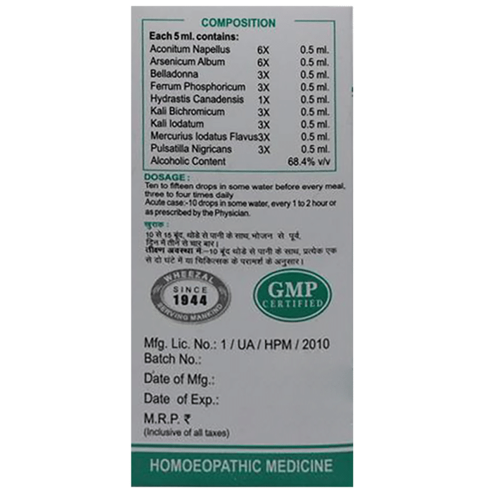 Aconitum napellu | Arenicum album | Belladonna | Ferrum phophoricum | Kali bichromicum | Hydrati canadeni | Kali lodatum | Mercuriu iodatu flavu | Pulatilla nigrican