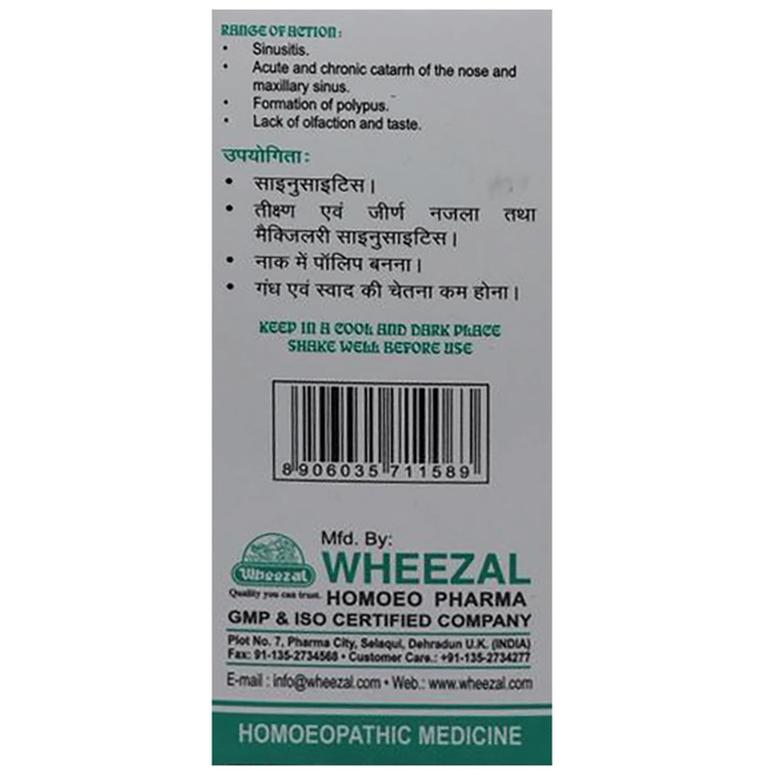 Wheezal WL37 Sinusitis Drop can help reduce sinus aches and catarrh and provide provisional relief. It can aid in reviving the sensory organs involved with the affected area. It can generally assist in reducing the inflammation of sinusitis. | Key Ingredients: Aconitum napellus Arsenicum album Belladonna Ferrum phosphoricum Kali bichromicum Hydrastis canadensis Kali lodatum Mercurius iodatus flavus Pulsatilla nigricans | Key Benefits: It can help reduce inflammation in the tissue layer of the mucous membrane It can help provide provisional relief from sinus aches and catarrh that affect the air passage It can aid in the prevention of polyp growth It can help revive the sense of taste and smell | Directions For Use: Consume by adding 15-20 drops of the medicine to half a cup of water 3 or 4 times a day before meals Acute cases: dilute 10 drops in half a cup and consume every 2 hours or as priscribed Use as directed by your physician | Safety Information: Self-medication is not advisable Do not exceed the recommended dosage Keep out of the reach of children Store in a cool and dry place