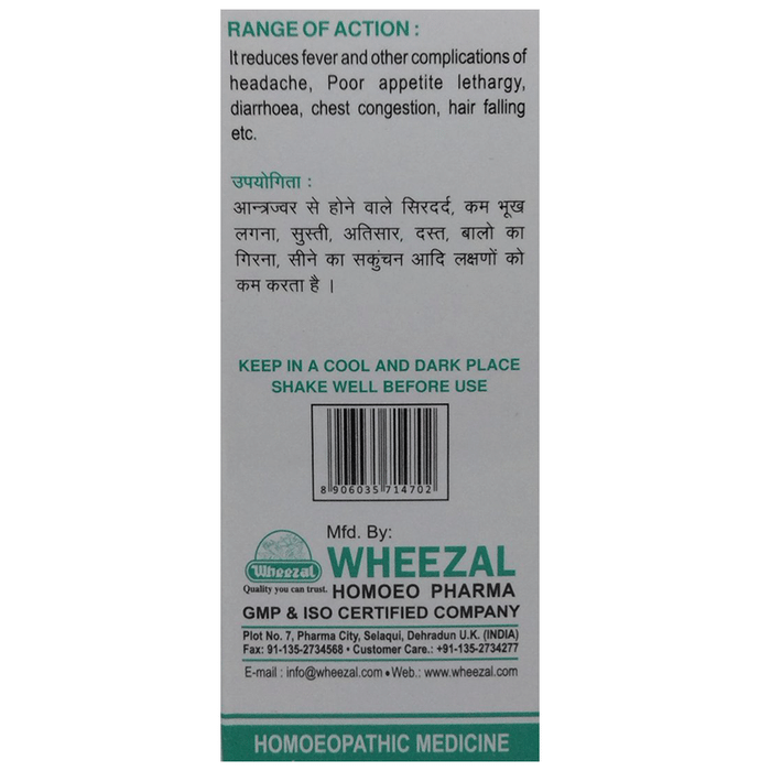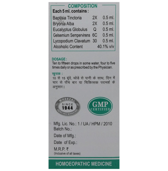 Wheezal WL47 Typhoid Drop is a homeopathic formulation used for the treatment of typhoid that is caused by Salmonella typhi bacteria, which is primarily contracted by consuming bacteria, either by food and water. | Key Constituents: • Baptisia Tinctoria 2X • Bryonia Alba 2X • Eucalyptus Globulus Q • Gelsemium Sempervirens 6C • Lycopodium Clavatum 30 | Key benefits: : • Formulated to treat typhoid fever • Helps in relieving the sensation of emptiness and weakness at the pit of the stomach • Used to treat dizziness, heaviness in the head, fatigue due to typhoid fever | Direction for use: 10-15 drops of the solution to be mixed with some water, four to five times a day or as directed by the physician. | Safety information: • Keep out of the reach of children • Read the label carefully before use