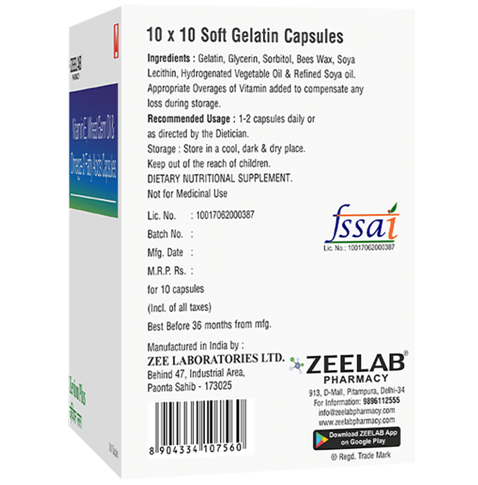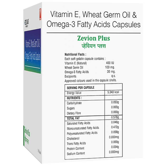 Zevion Plus Soft Gelatin Capsule contain certain ingredients like natural vitamin E, omega 3 fatty acid and wheat germ oil that might help to maintain all the systems of your body to function or perform well, including the brain, skin, organs, respiratory system, and circulatory system. | Key Ingredients: Vitamin E 400 I.U. Wheat germ oil 100 mg. Omega-3 fatty acids 30 mg | Key Benefits: Vitamin E is one of the best antioxidants, which may play a great role as a protector. As it can protect the skin from pollution, ultraviolet rays, and other elements that can cause by free radicals. Plus, it may help the skin look fresh and young by decreasing the appearance of wrinkles and fine lines Omega 3 fatty acid is a crucial fatty acid, which may play a vital role in brain function and managing cardiovascular-related concerns Wheat germ oil may help boost the immune system, skin blood circulation, and cell regeneration. In short, it can improve the overall function of your health. It is quite effective for dry skin and can heal the damaged cells caused by the red-hot sun. Wheat germ oil can help dermatitis and scarring conditions | Directions For Use: As prescribed by the physician. | Safety Information: Read the label carefully before use Store in a cool and dry place, away from sunlight Keep out of reach of children Use under medical supervision Don't exceed the recommended dosage