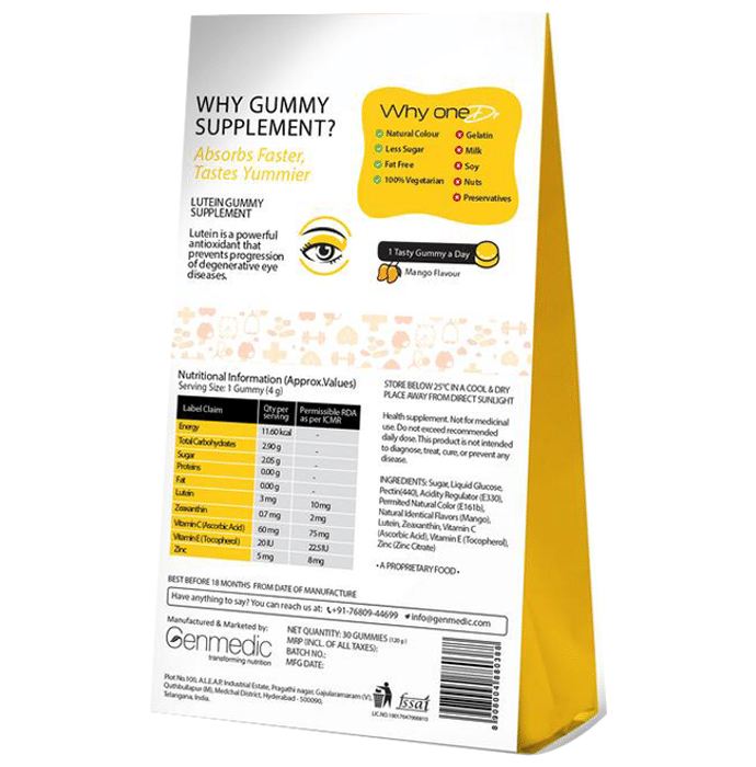 oneDrful Life Lutein Gummy Supplement for Better Vision Mango oneDrful Life Lutein Gummy Supplement for Better Vision contains Lutein and Zeaxanthin as the active ingredients, primarily used to improve eye health and to manage eye related disorders. It helps reduce the risk of degenerative eye diseases and contains essential vitamins to improve overall health. It is a great source of antioxidants which protects the cells from the damage caused by free radicals and improves vision and eye clarity.